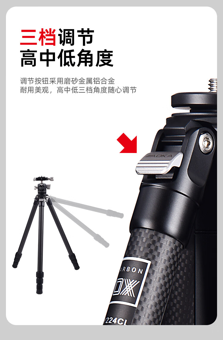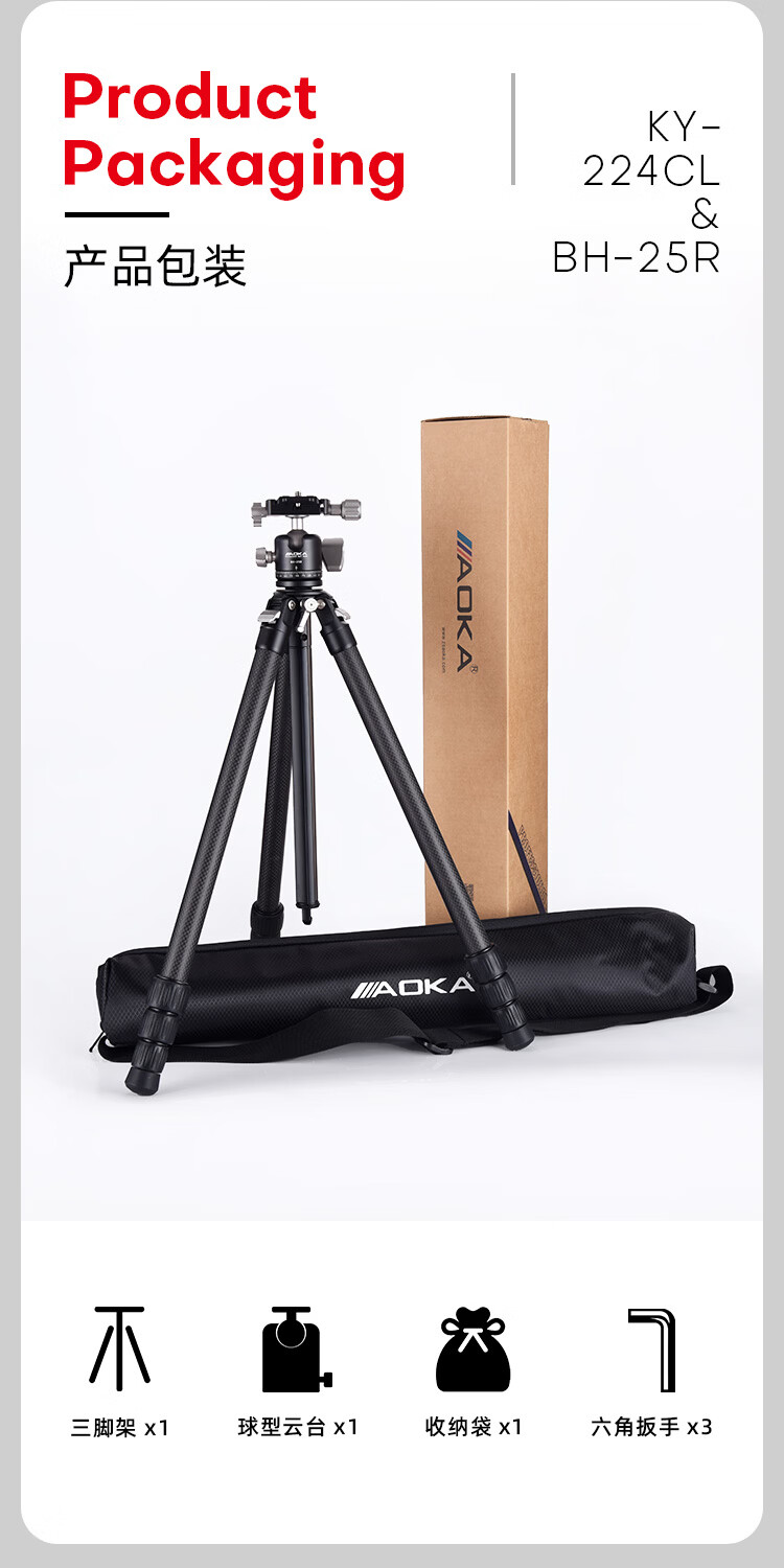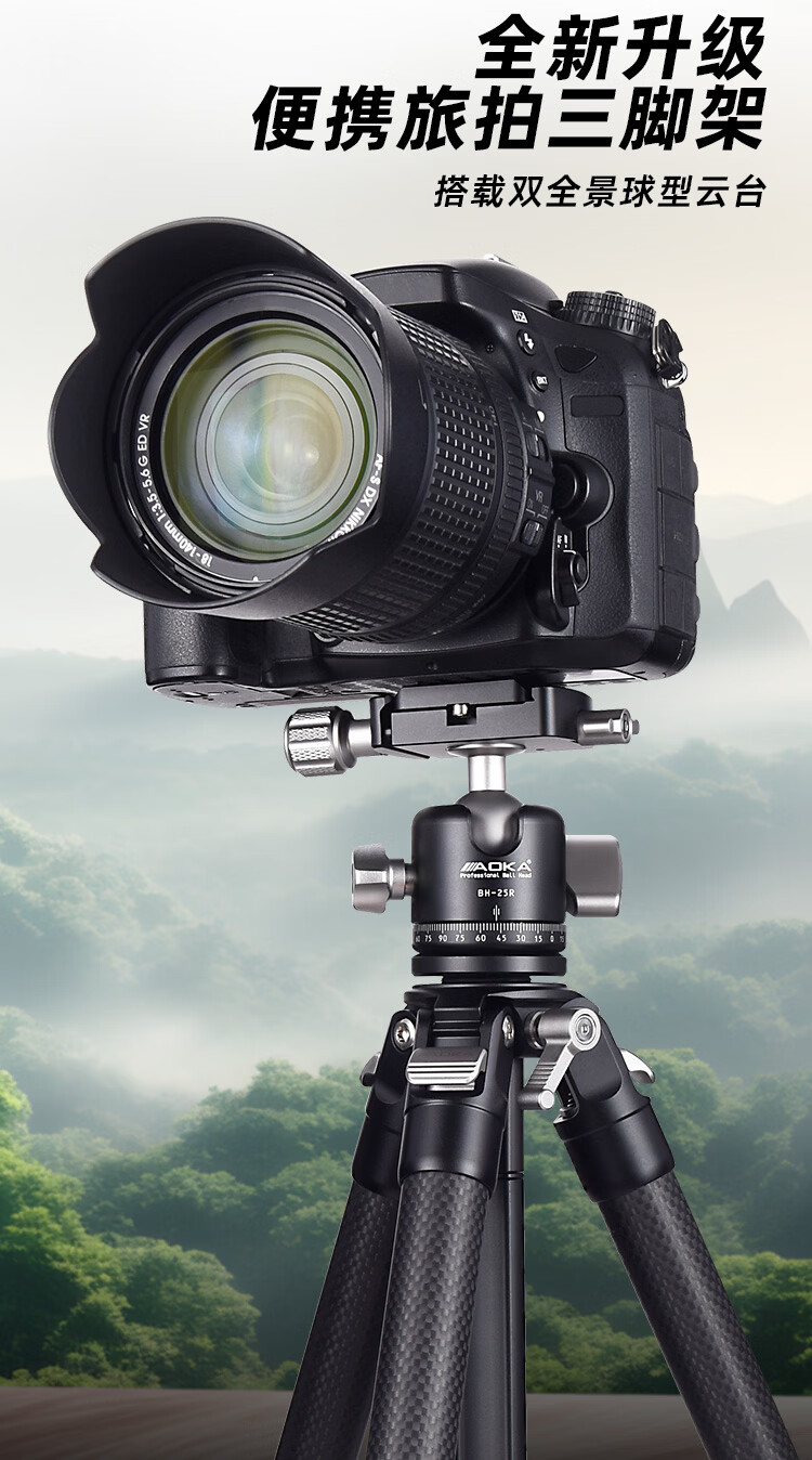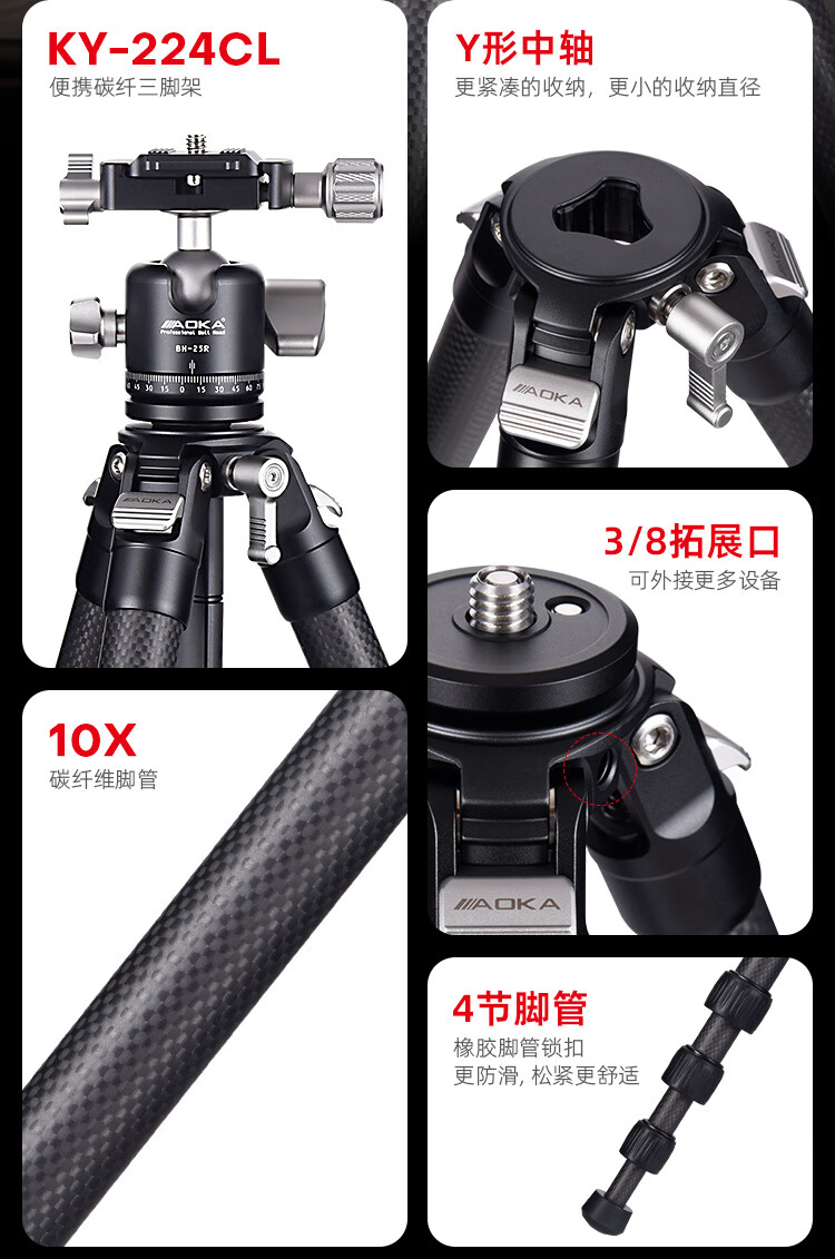 AOKA奥咔KY224CL碳纤维三脚架双全景云台套装便携三脚架户外旅行拍摄vlog视频支架专业微单摄影 黑色 KY224CL