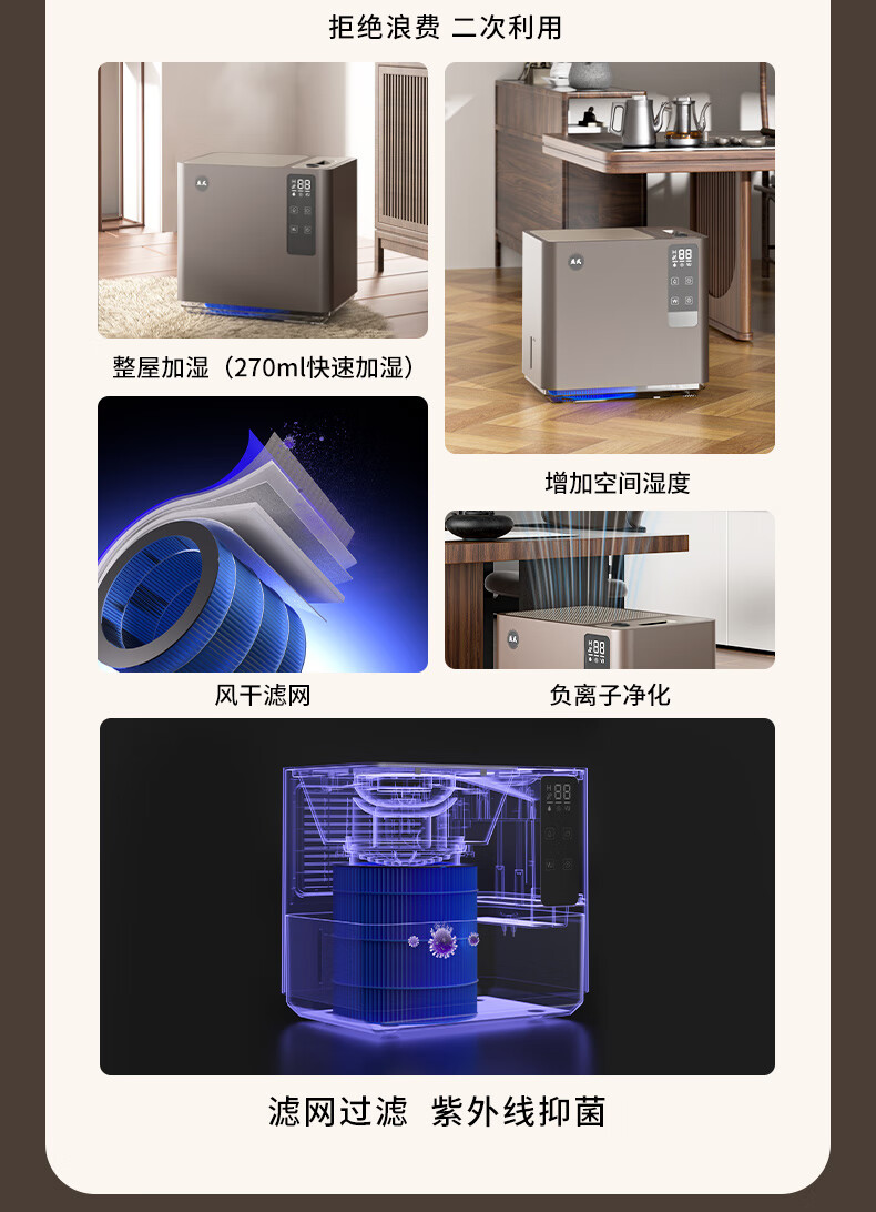 益武免倒茶水桶无雾负离子净化紫外线抑菌加湿器家用客厅办公室神器 银咖色【三芯装】