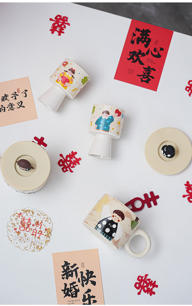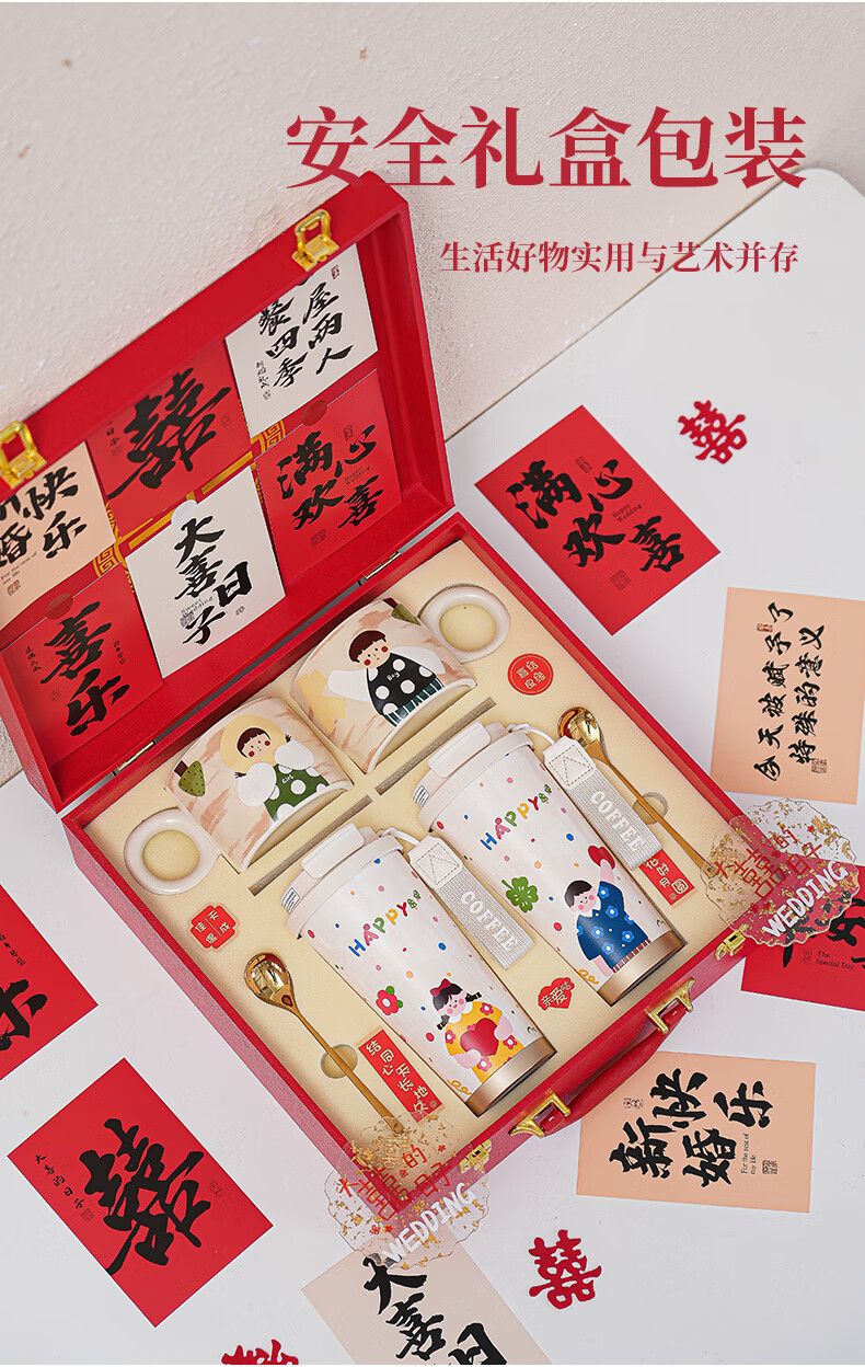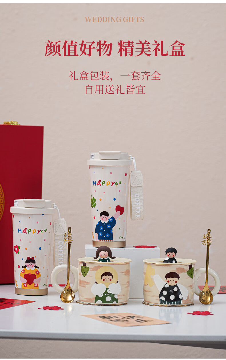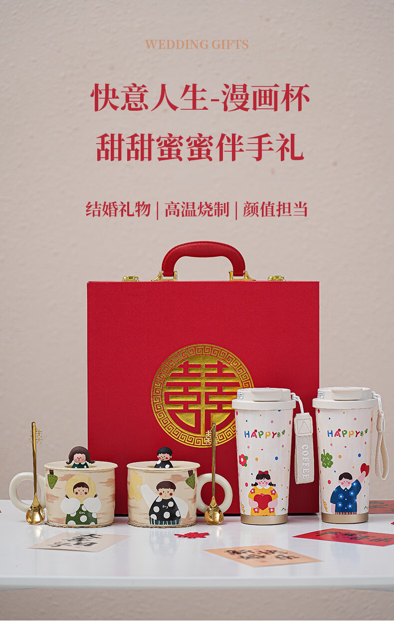 赟娅新婚结婚礼物送新人新娘简约高级感实用保温杯伴手礼结婚用品必备 大囍漫画陶瓷对杯+保温杯(新婚快乐贴纸)
