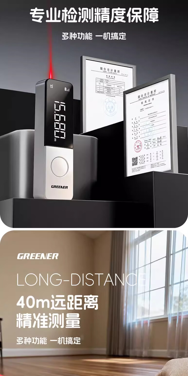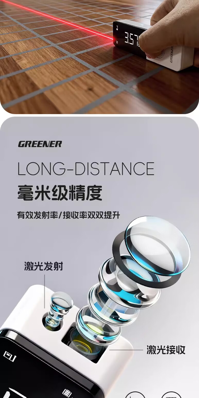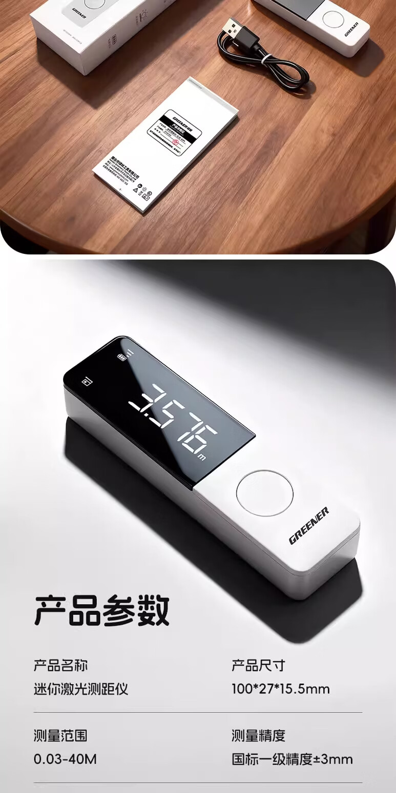 绿林(GREENER)激光测距仪红外线测量仪工业级高精度锂电量房手持式测量仪器 40米-高雅白【多功能测量+type-c直充】
