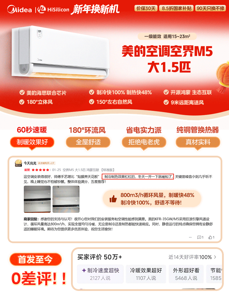 美的空调 空界M5 大1.5匹新一级能效 舒适风节能省电 【纯铜管】 卧室空调挂机国家补贴KFR-35GW/M5