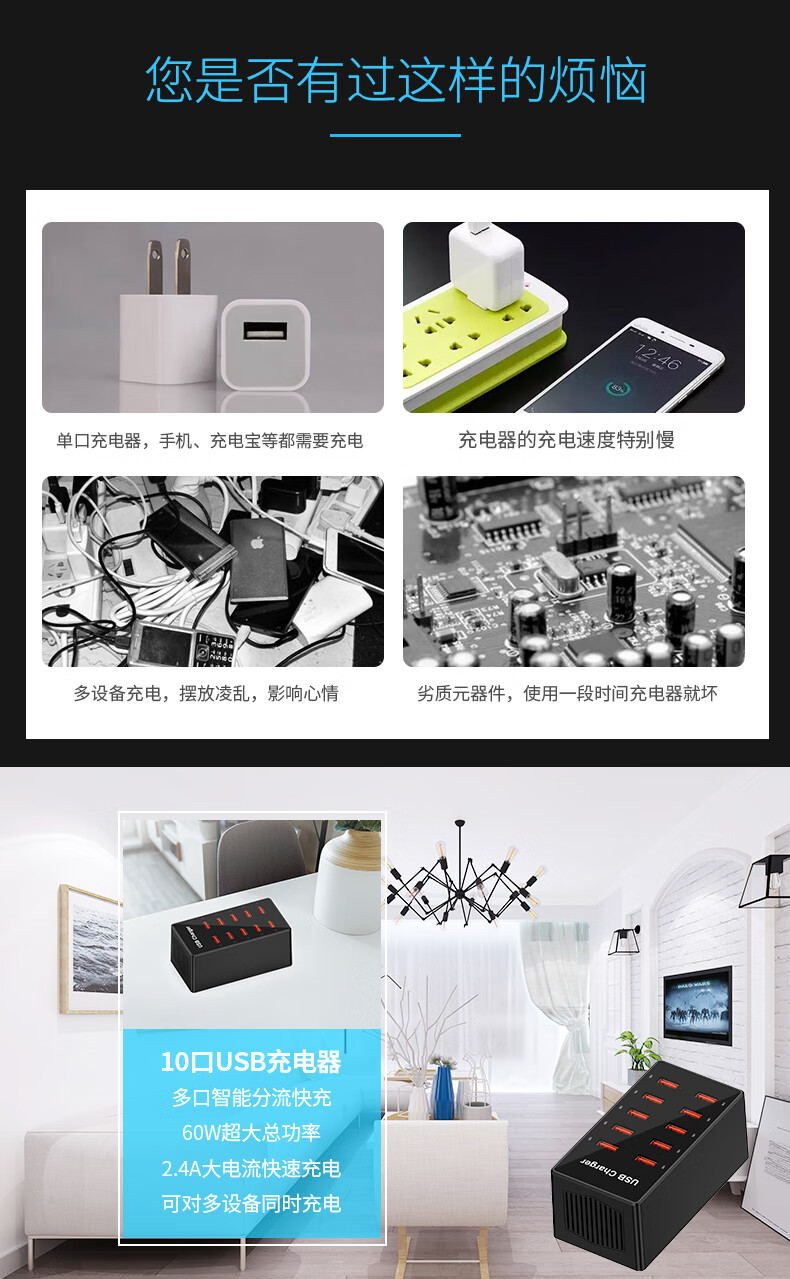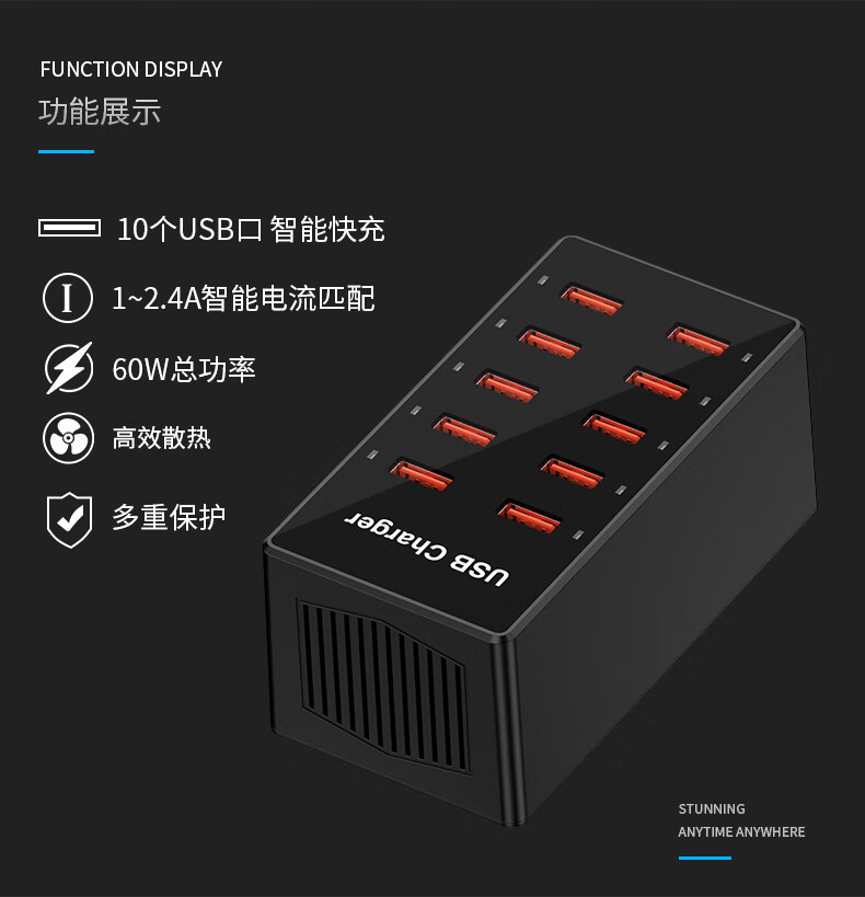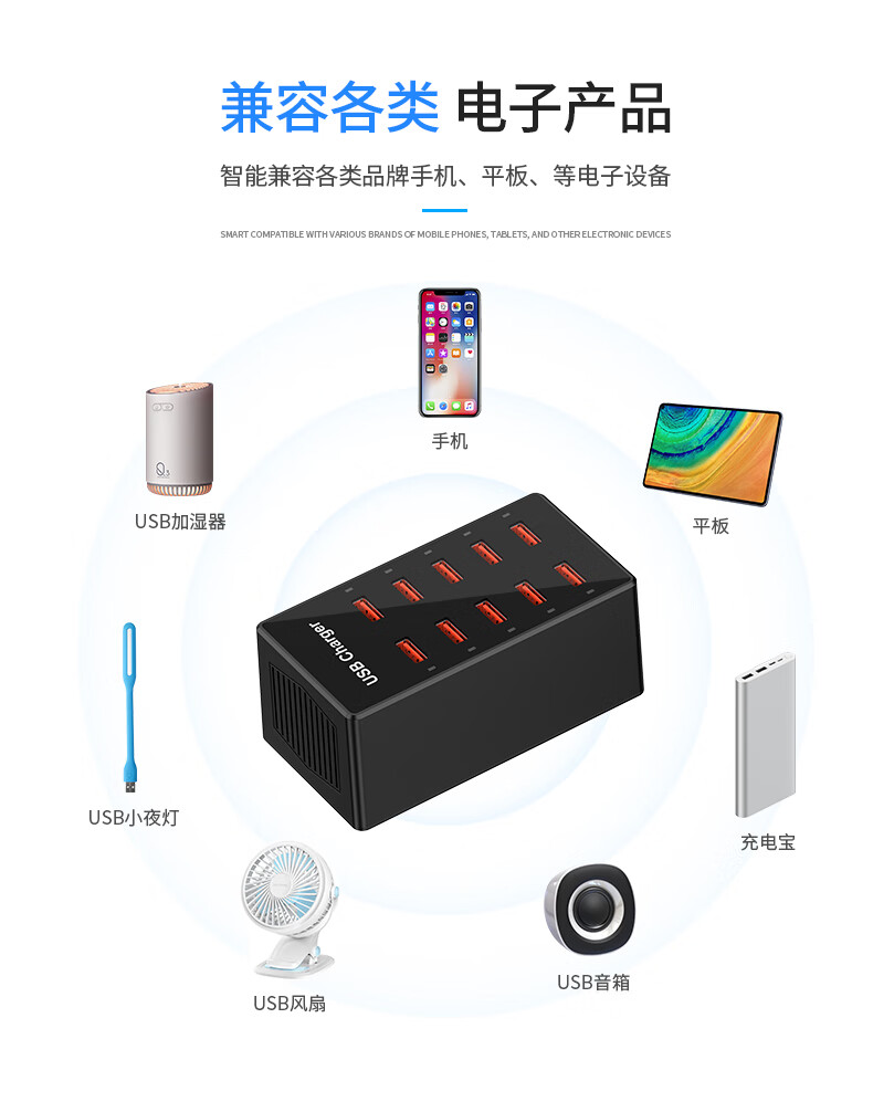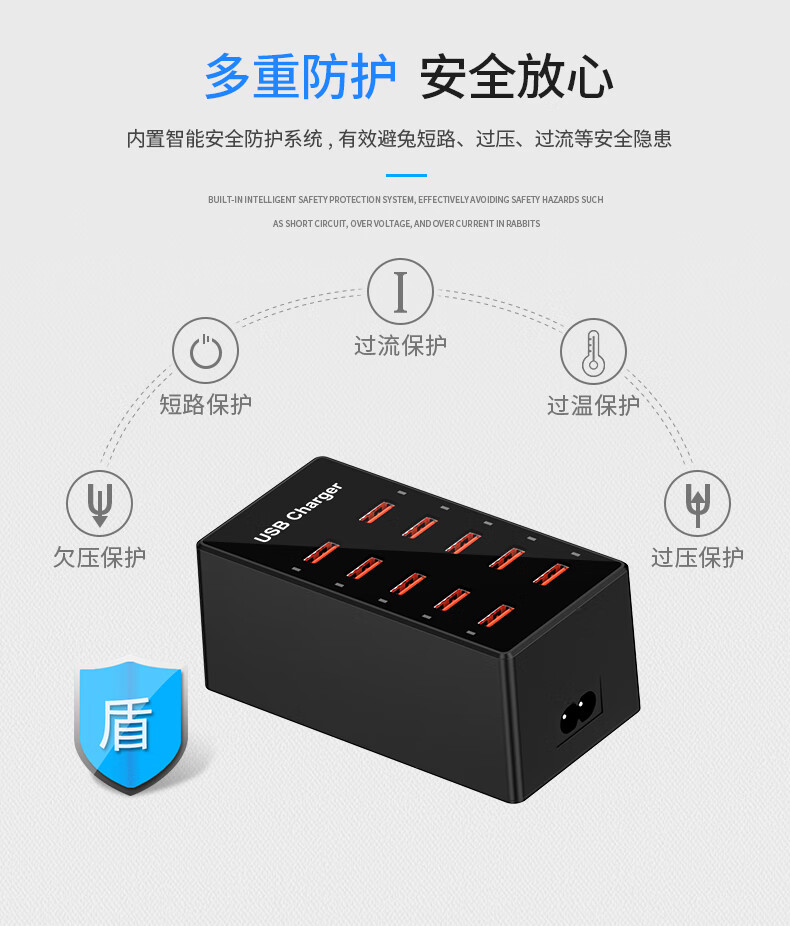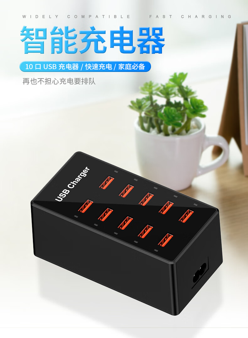CAIBEIKE多口usb充电器插排插头多孔快充通用大功率智能电源桩桌面充电站 黑-【CEFC认证】带散热10口60W 充电器