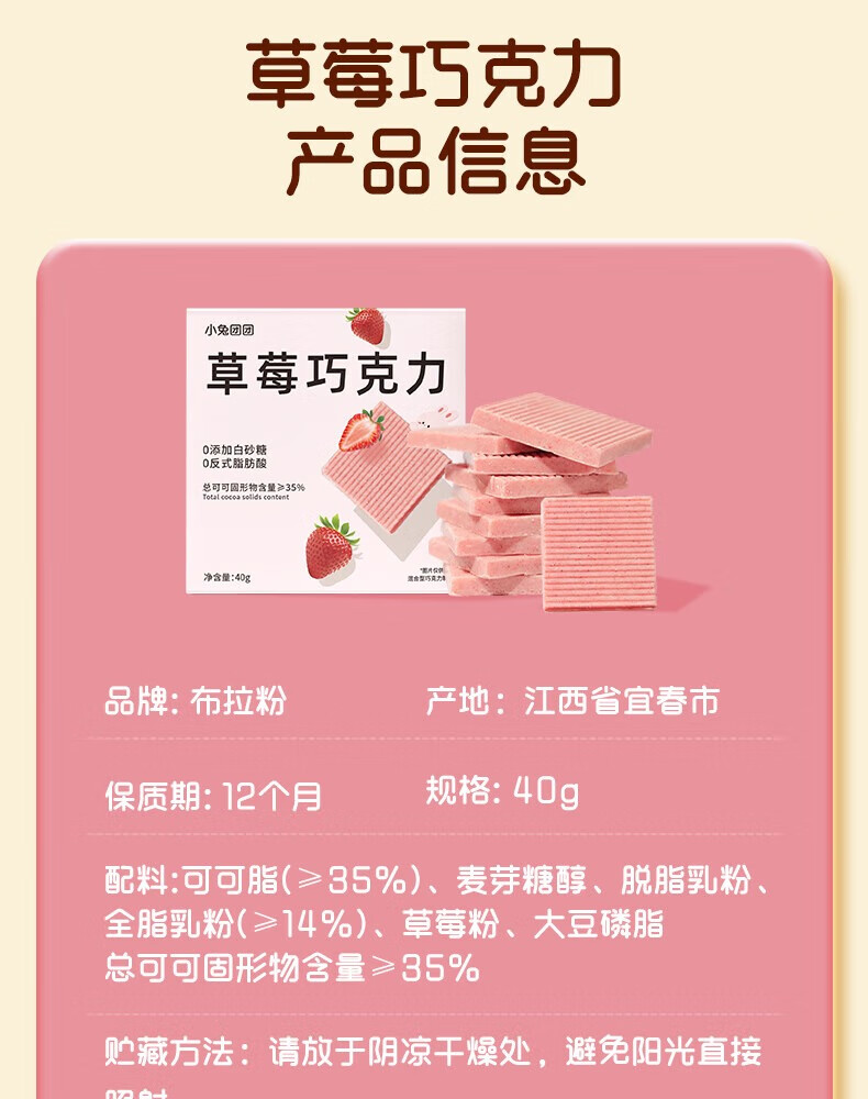 布拉粉小兔团团无添加蔗糖牛奶巧克力进口可可脂健康儿童零食糖果 草莓味一盒