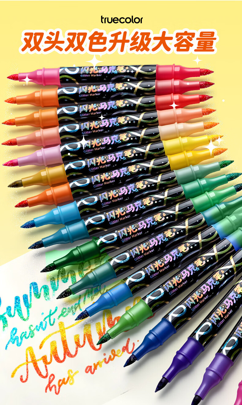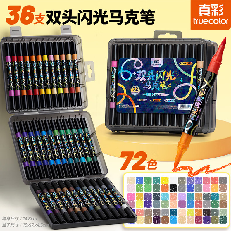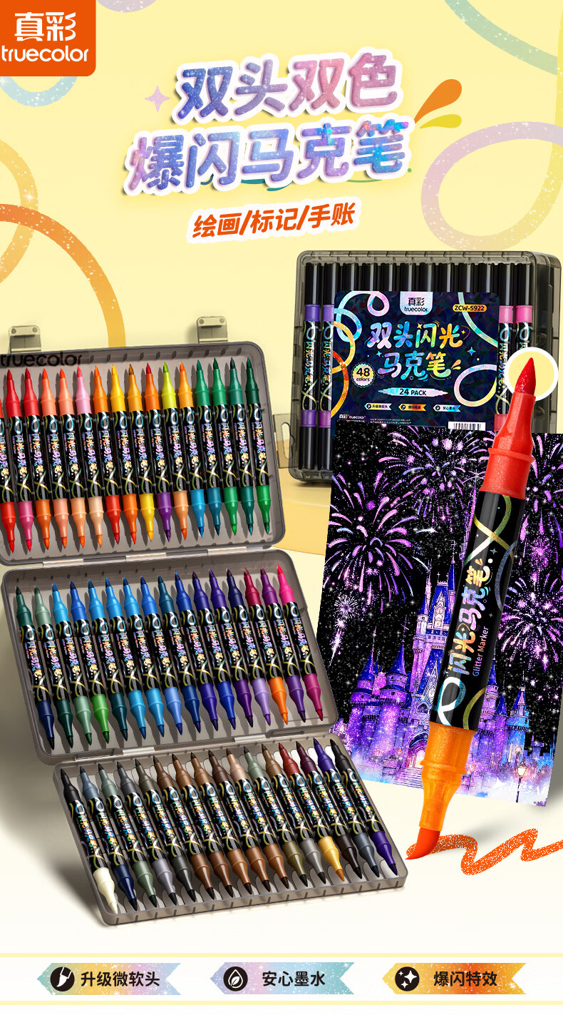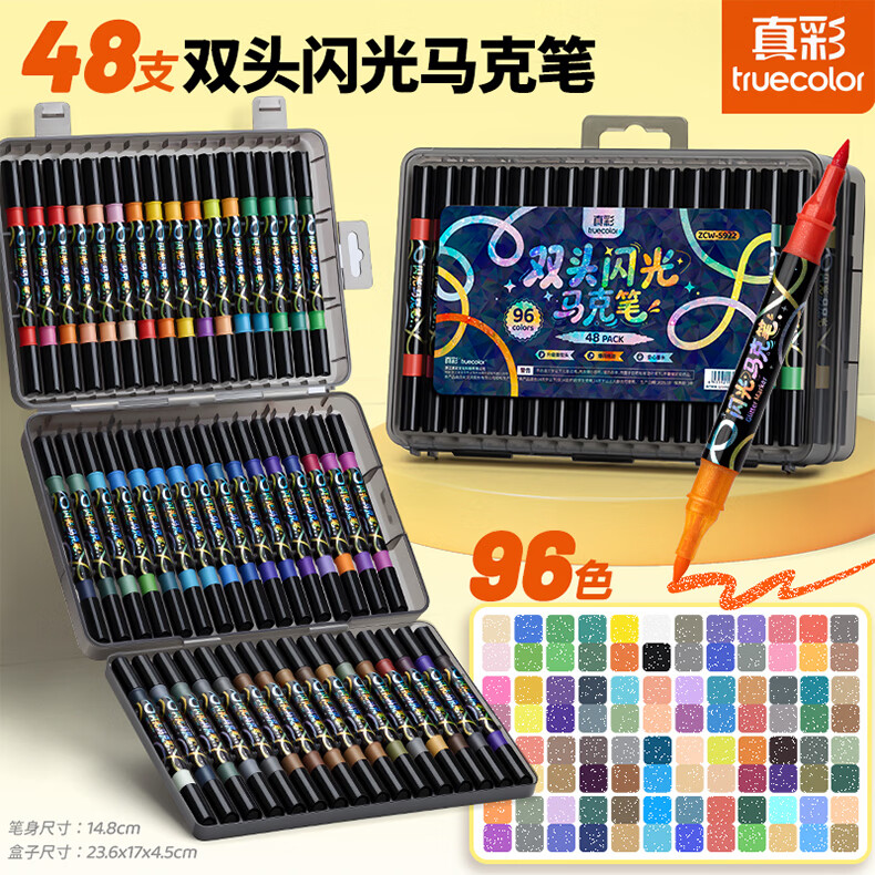 真彩双头双色闪光软头马克笔儿童炫彩色笔荧光笔啫喱笔小学生画画记号笔手账标记闪粉笔水彩流沙笔 96色【双头双色闪光马克笔】升级软头