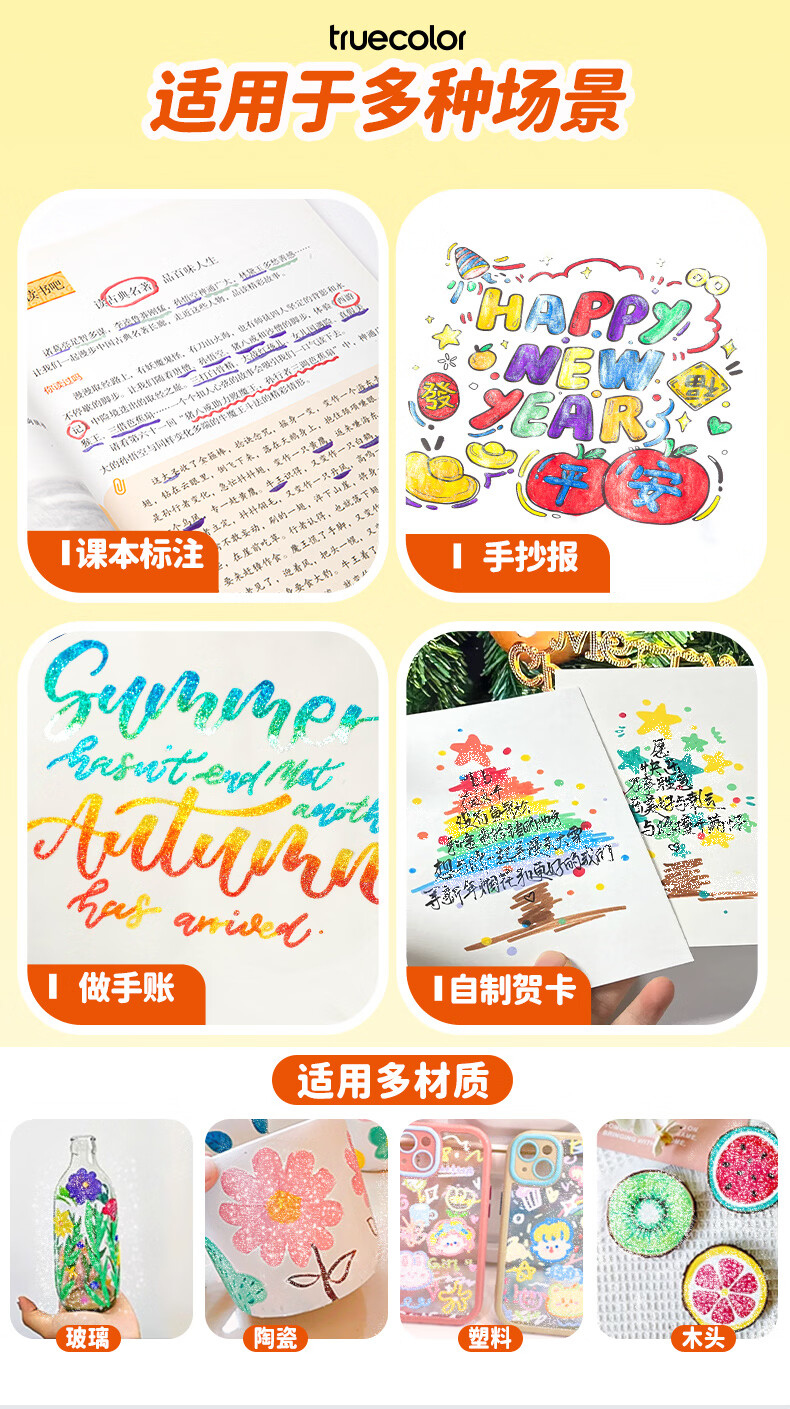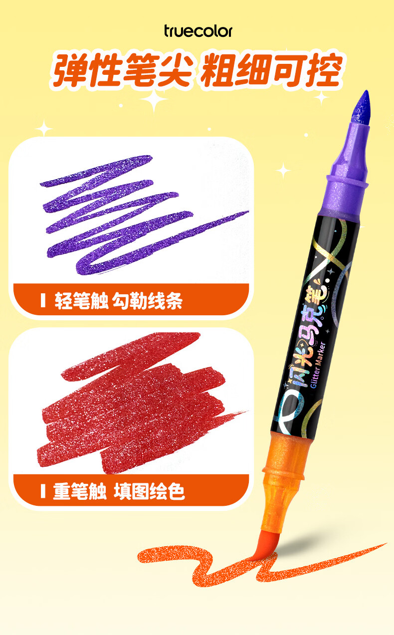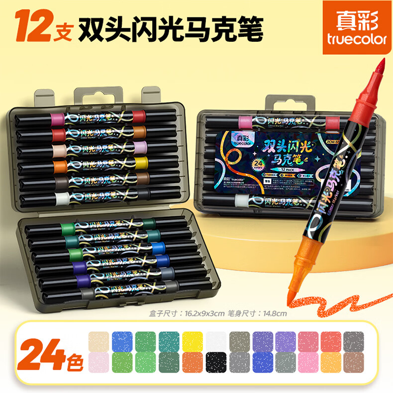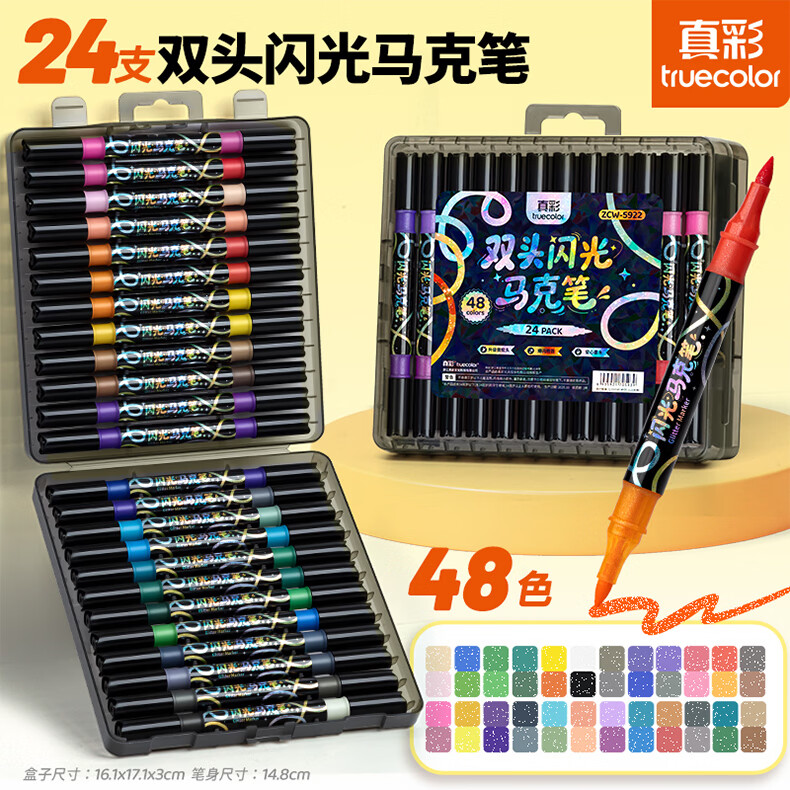 真彩双头双色闪光软头马克笔儿童炫彩色笔荧光笔啫喱笔小学生画画记号笔手账标记闪粉笔水彩流沙笔 96色【双头双色闪光马克笔】升级软头