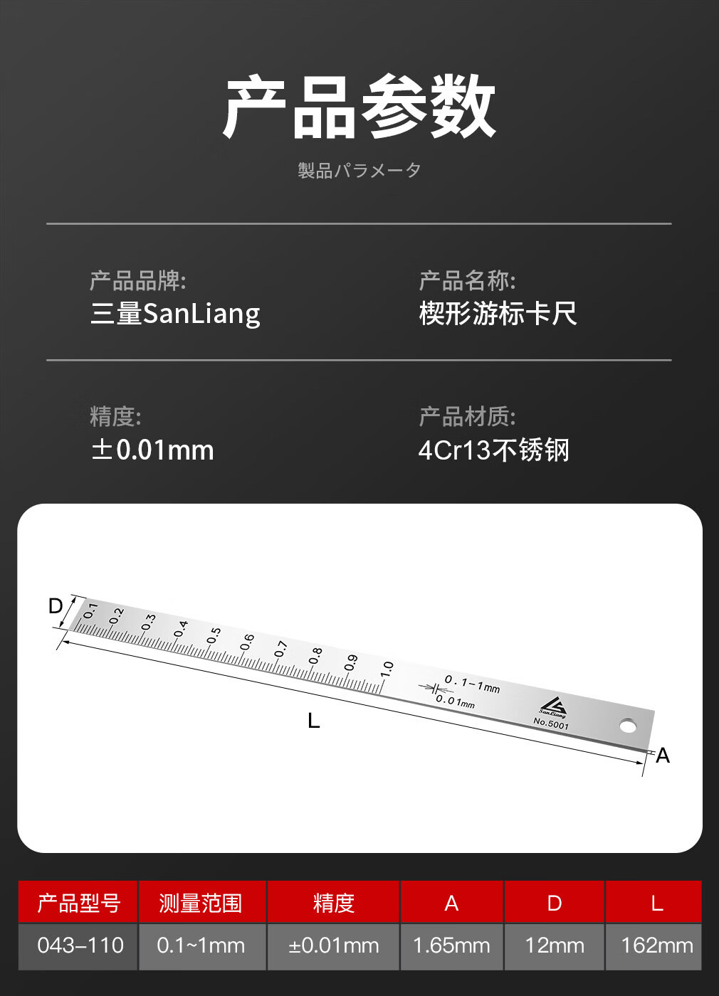 三量(sanliang)三量楔形游标卡尺高精度0.01mm塞尺尖头间隙尺楔形塞尺缝隙尺 043-110 量程0.1-1mm(高精度0.01mm) 无规格