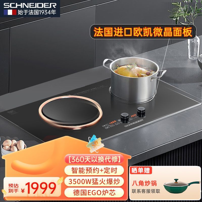 法国SCHNEIDER电磁炉凹面双灶台式嵌入智能电陶炉家用大功率爆炒